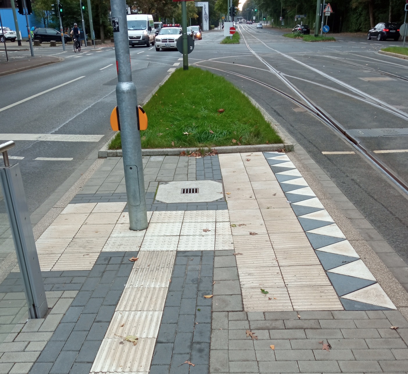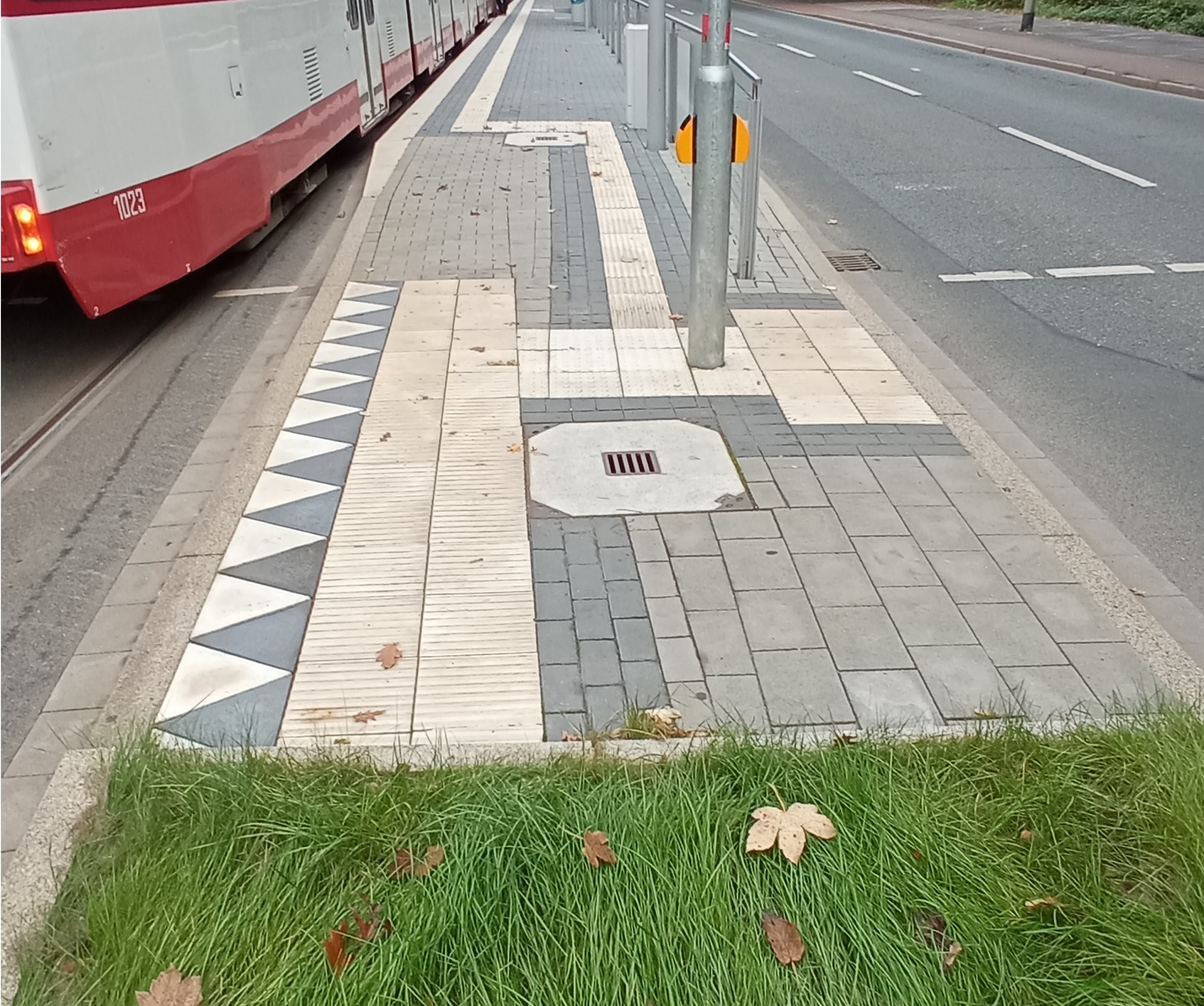 Hauptmerkmale der Baustelle sind die Verkehrsdreiecksplatten 33,5 / 29 / 8 cm und die Rippenplatten Typ III in der Ausführung mit 8 Rippen (mit Weißauflage) 30 / 30 / 8 cm sowie den Noppenplatten mit Halbkugelnoppen in orthogonaler Anordnung in 30 / 30 / 8 cm (mit Weißauflage).